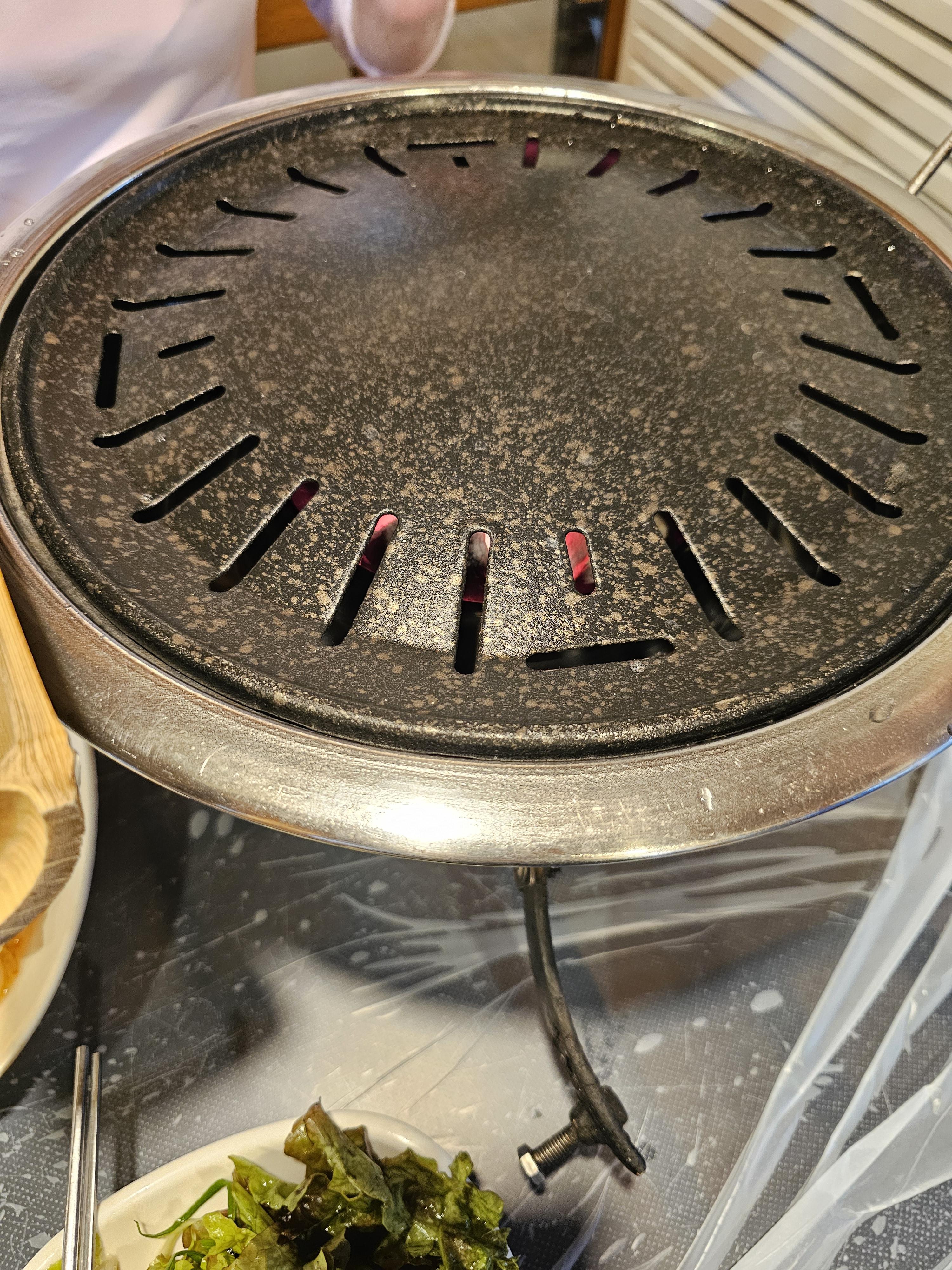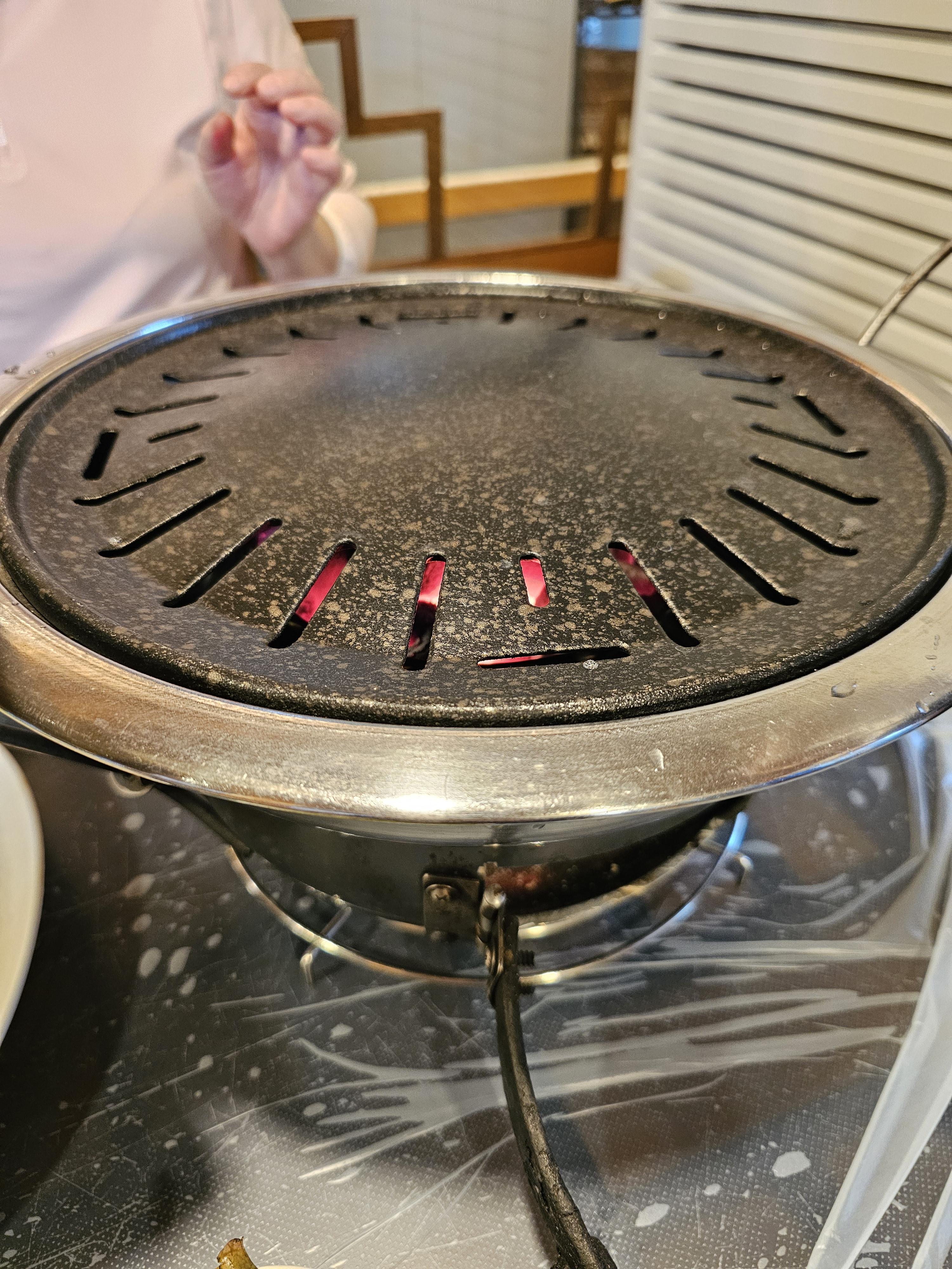 일반적인 숯불이 아니라 숯불을 화로에 담아와 주십니다. 그런데 이게 조금 높아서 키가 작으신 분들은 굽지 못할 걸로 예상됩니다.