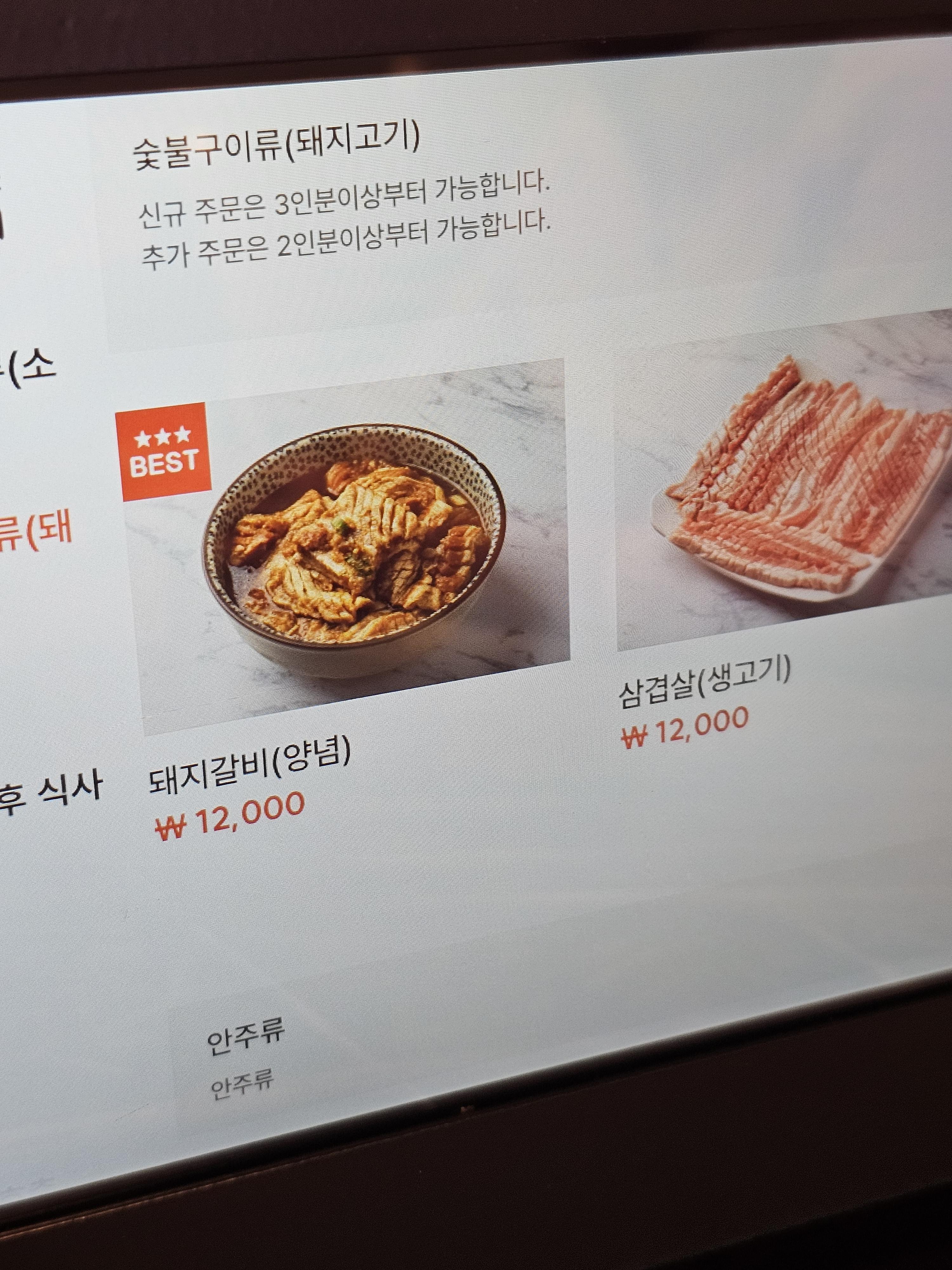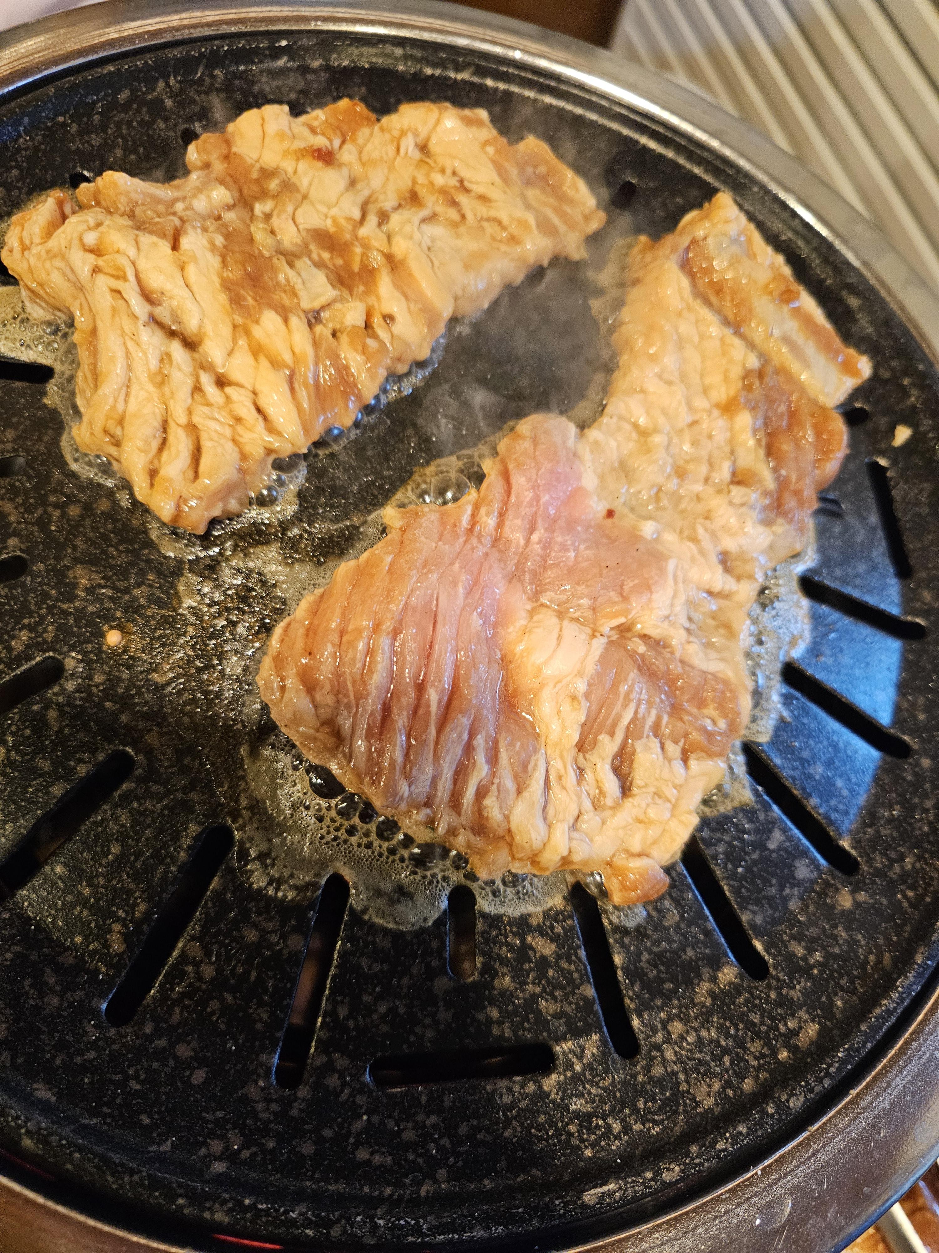 돼지고기로는 1인분에 12,000원, 최소 3인분부터 가능합니다. 저희는 2명이어서 3인분을 먹었습니다.